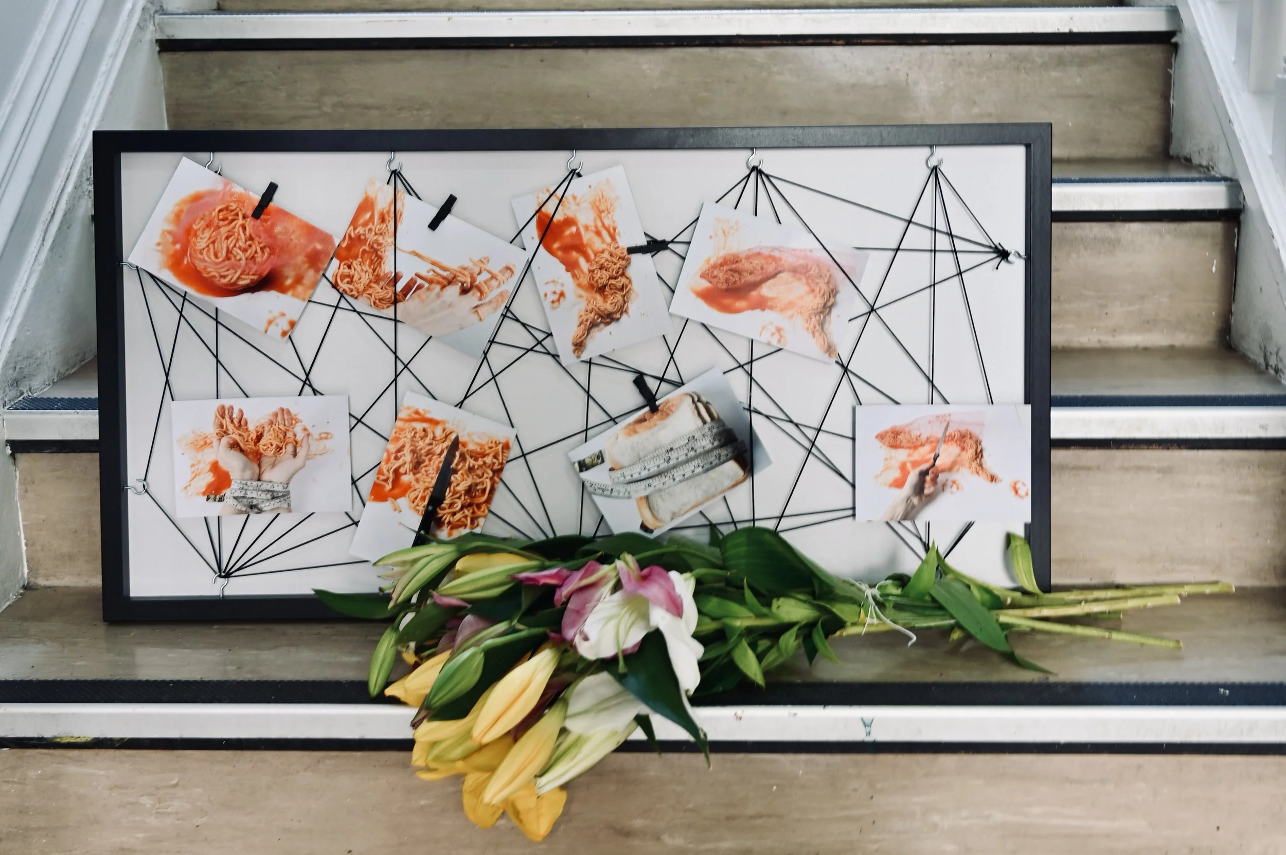 Exhibited work Crime Scene- Death of the Spagetti, flowers from Panna
